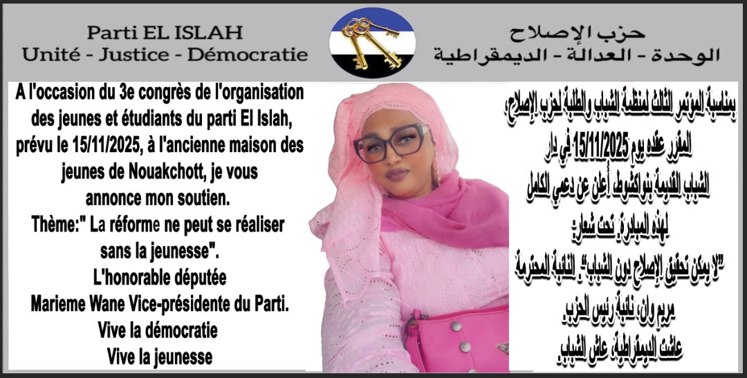 L’Organisation des jeunes et étudiants du parti El Islah compte organiser son 3e congrès, le samedi 15 novembre 2025, à l’ancienne maison des jeunes de Nouakchott, à cette occasion, la vice-présidente et députée Mme Marième Wane annonce son soutien indéfectible à la jeunesse du pays en général et à celle du parti en particulier.