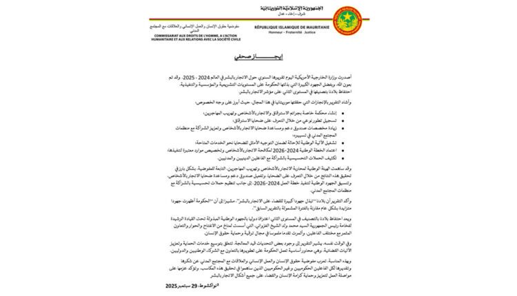 Le rapport 2024-2025 du Département d’État américain sur la traite des personnes, publié mardi 30 septembre 2025 , salue les